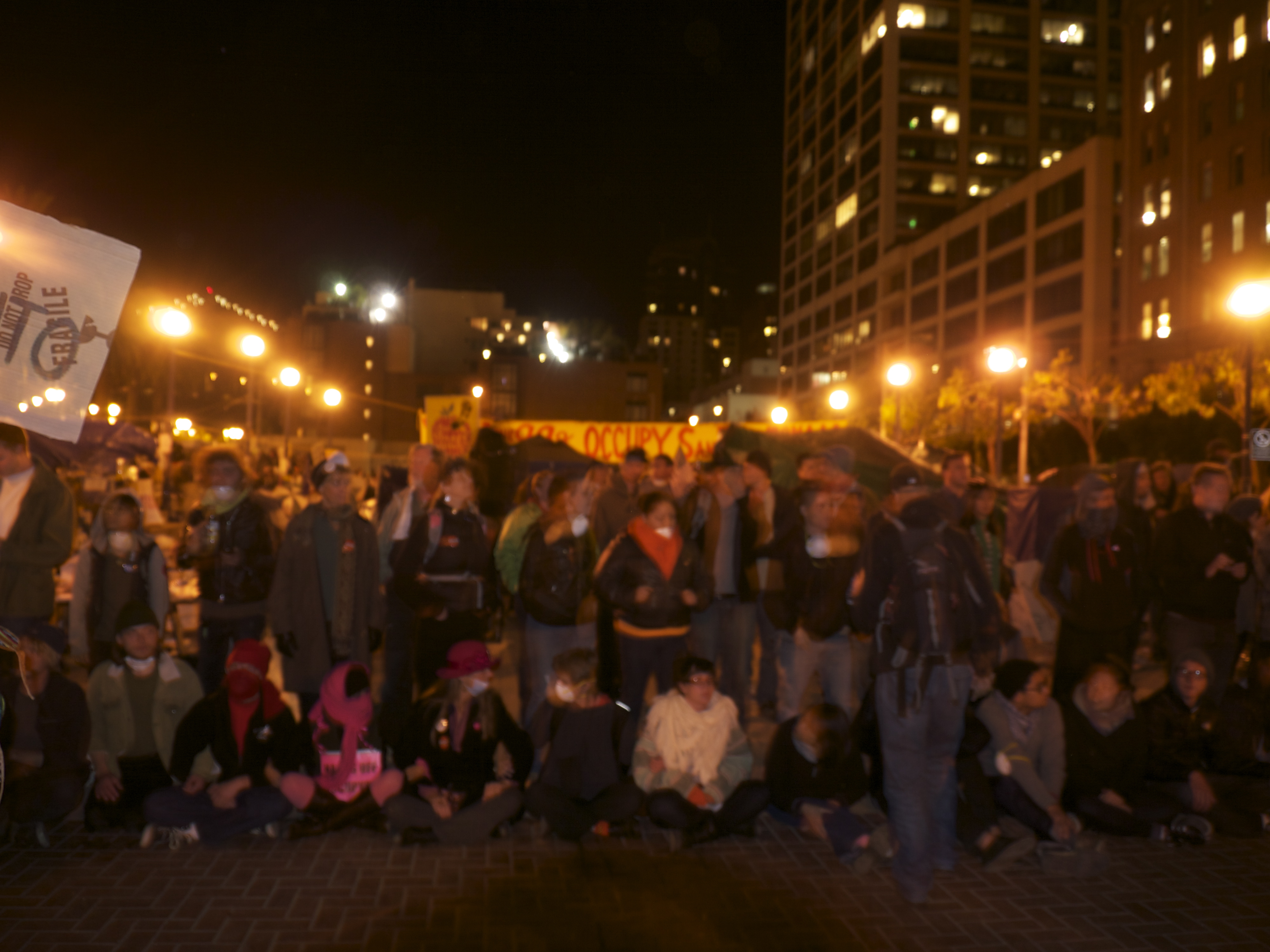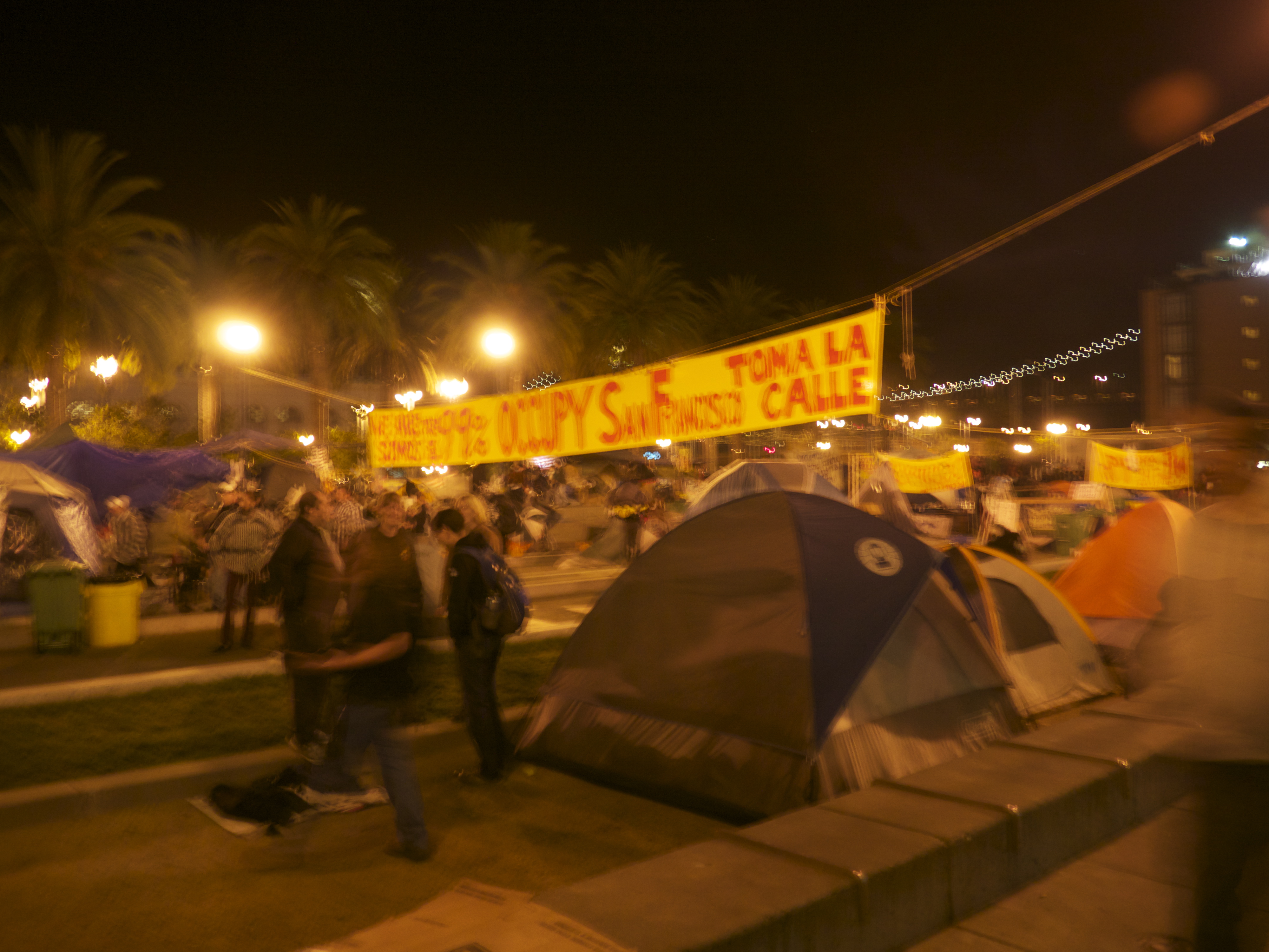 I arrived at about 11:30pm, after walking several extra city blocks to Justin Herman Plaza due to the closure of the closest MUNI station at Embarcadero by police to prevent an influx of protestors to this side of the bay from #Occupy Oakland. A rally was held earlier in Oakland in support of those who were violently evicted on Tuesday evening from Frank Ogawa Plaza.