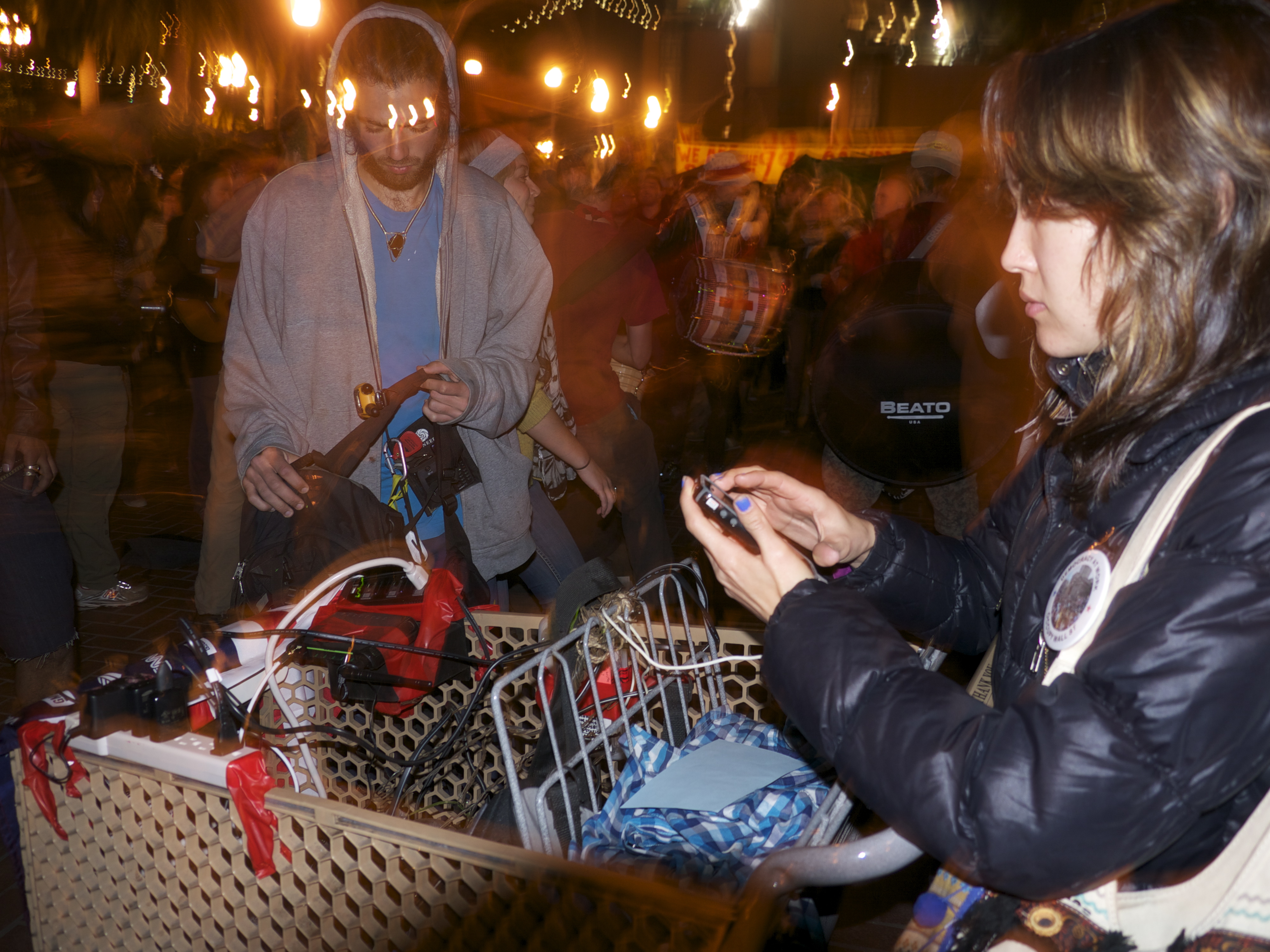 There were about 300-500 people at JH Plaza when I arrived. It was a festive atmosphere. I burned some rosewood incense in support. By 12:30am, there were closer to 1,500 people. Several dudes walking around sending out live feeds with their tablets and laptops. Mic checks. We began practicing forming human chains to protect the camp. Some people offer tips on avoiding tear gas by dousing a towel with vinegar to breathe through.