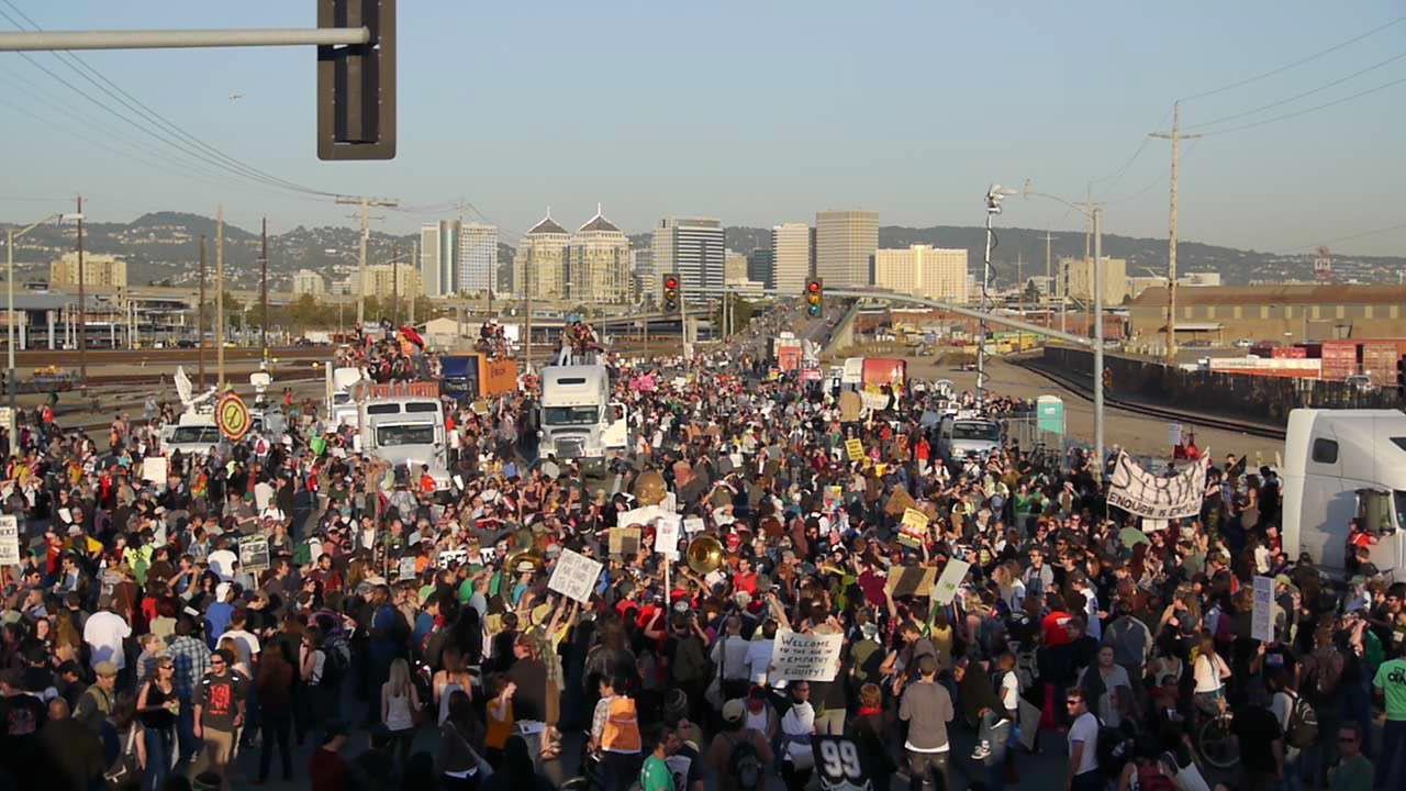 At 4pm, after a series of rousing speeches at the general assembly of the Occupy camp in front of City Hall, thousands of us began marching toward the Port of Oakland. The scene upon reaching the overpasses leading to the docks was surreal.