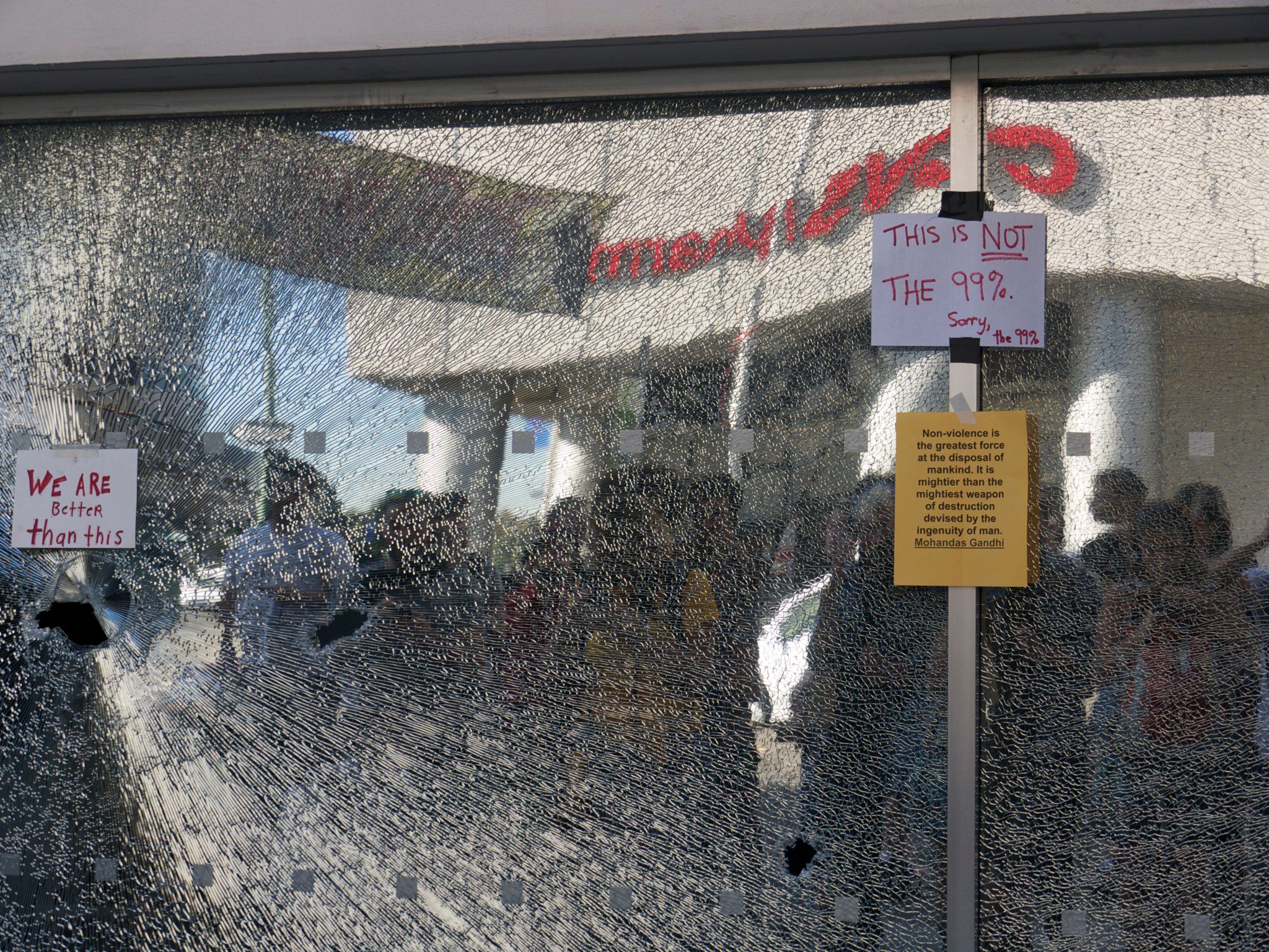 The extent of my frustration with this small faction of anarchists is hard to express. They succeeded in tainting the symbolic power of Wednesday’s march by giving the main stream media exactly the sorts of images they needed to denounce the movement as chaotic and violent. Is capitalism a violent and oppressive economic system? Yes. But we will never critique it successfully by trying to fight it on its own terms. Only peaceful resistance has the moral power to transform people’s hearts and minds in the way that is needed. Capitalism rules over us because of the alienation, fear, and social fragmentation it encourages. This alienation, experienced by so many “consumers” and workers in this country, is only strengthened by the infantile temper tantrums of anarchists. What is their mission, really? I remain confused and disgusted by their tactics.