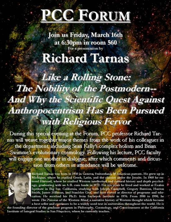 Richard Tarnas “Like a Rolling Stone: The Nobility of the Postmodern…” –a lecture at CIIS on March 16th at CIIS