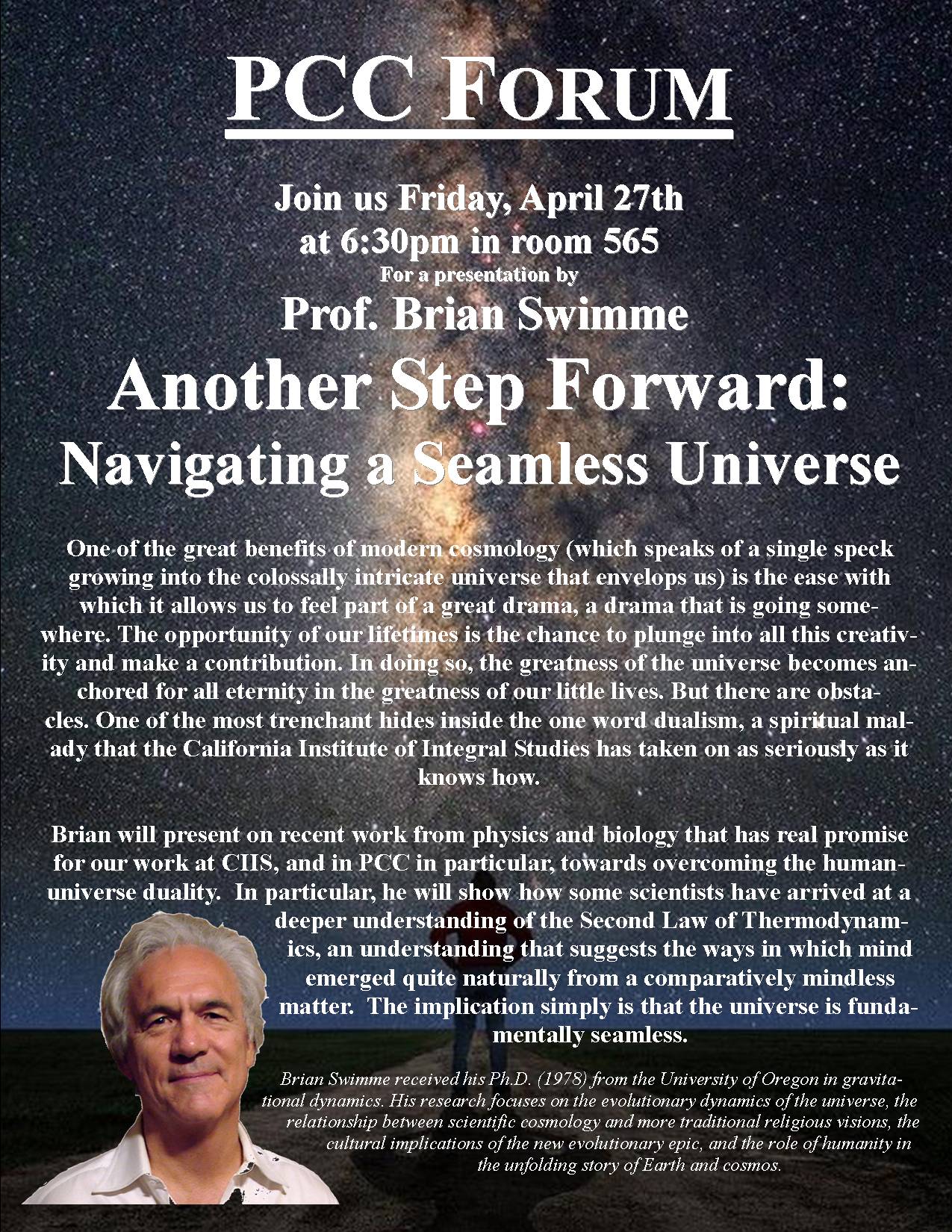 Cosmologist Brian Swimme will be presenting at the PCC Forum at CIIS in San Francisco, CA this Friday, April 27th at 6:30pm in room 565. The lecture is free and open to the public.