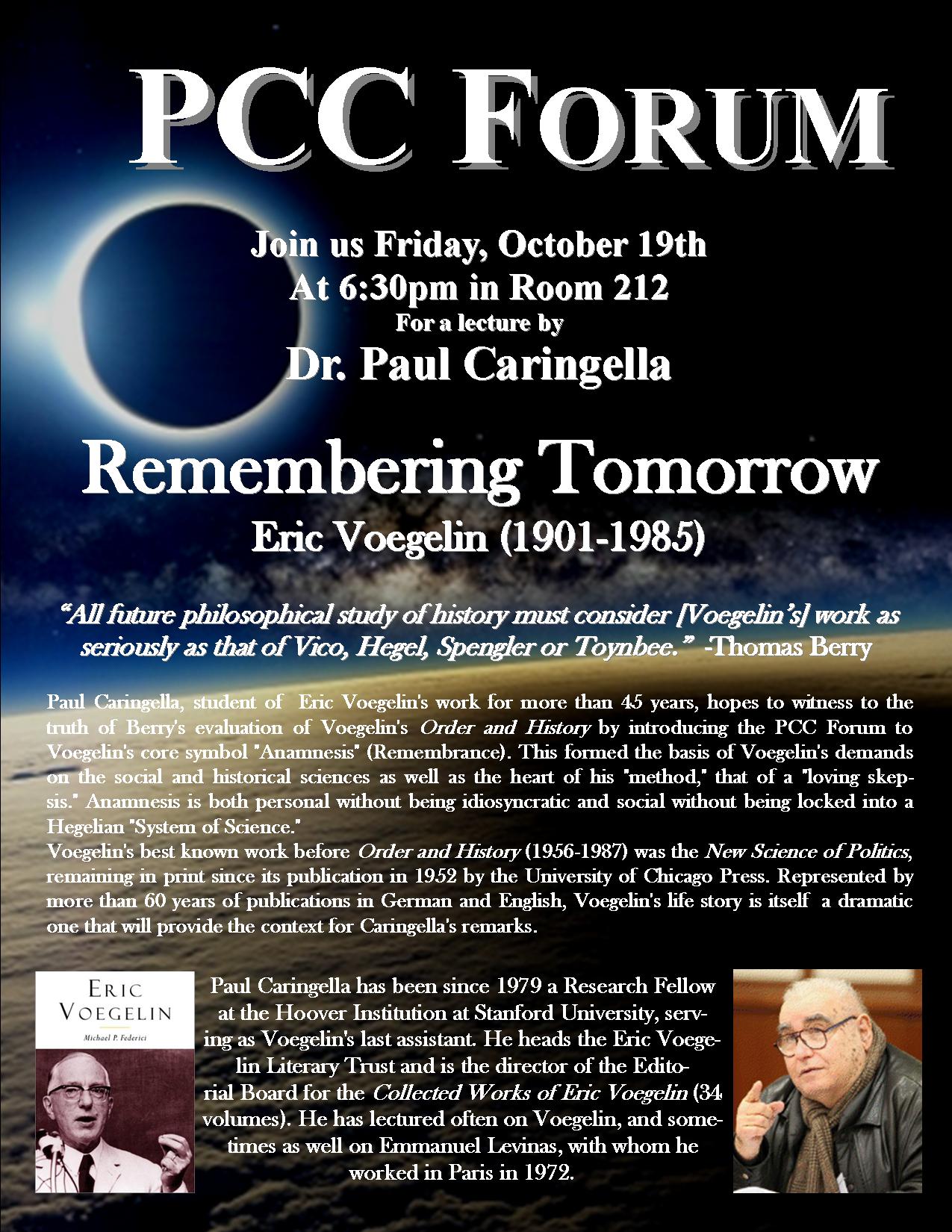 For those who are in the San Francisco Bay Area, please join us at the PCC Forum this Friday at the California Institute of Integral Studies (1453 Mission St.) where Dr. Paul Caringella will speak about Voegelin‘s philosophy of history. Also on the menu will be Levinas, Hegel, Buber, and Plato. The lecture is free of charge and begins at 6:30PM in room 212 (2nd floor).