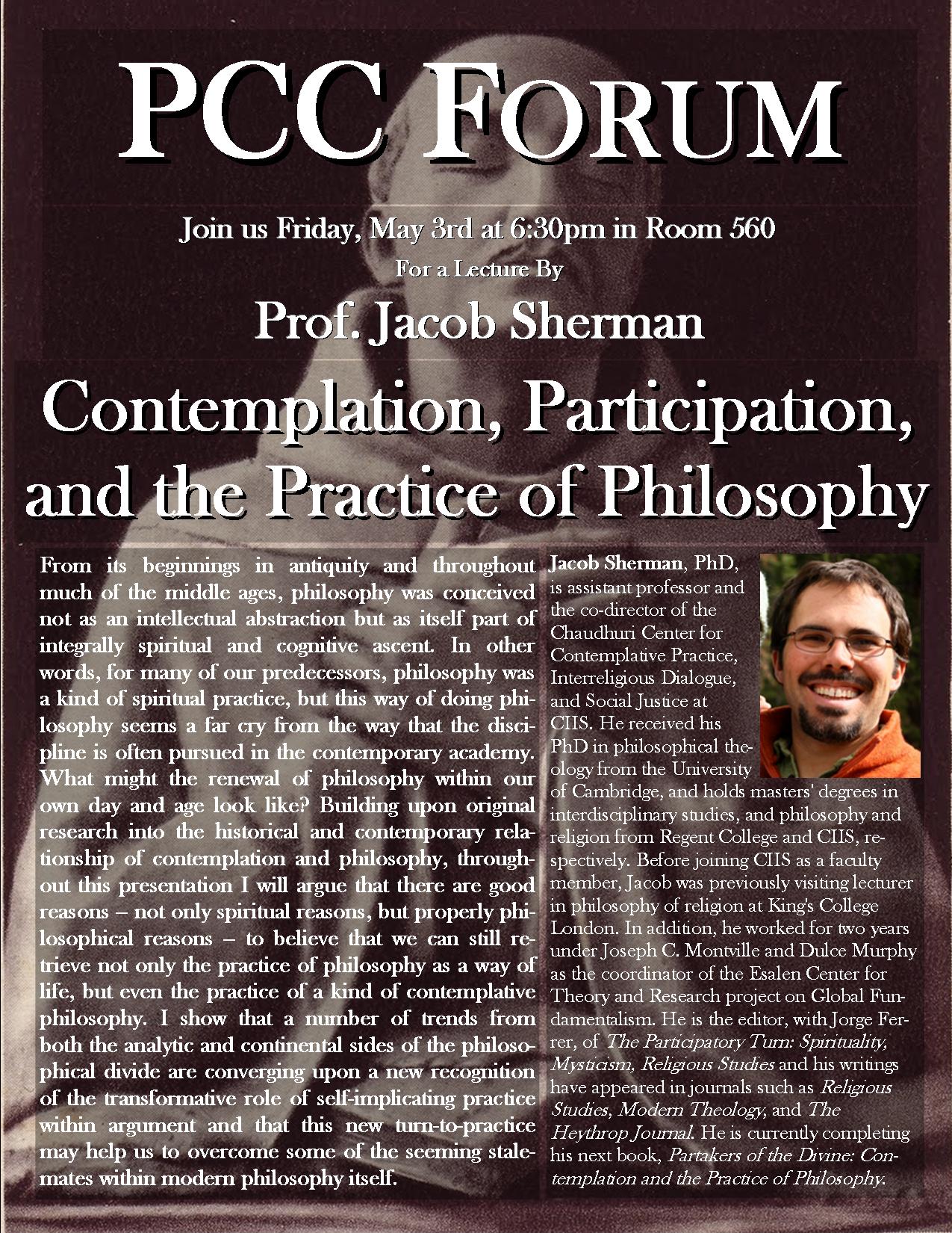 The PCC Forum will be welcoming CIIS’ own Prof. Jacob Sherman this Friday, May 3rd at 6:30pm in room 560. The lecture is free and open to the public.