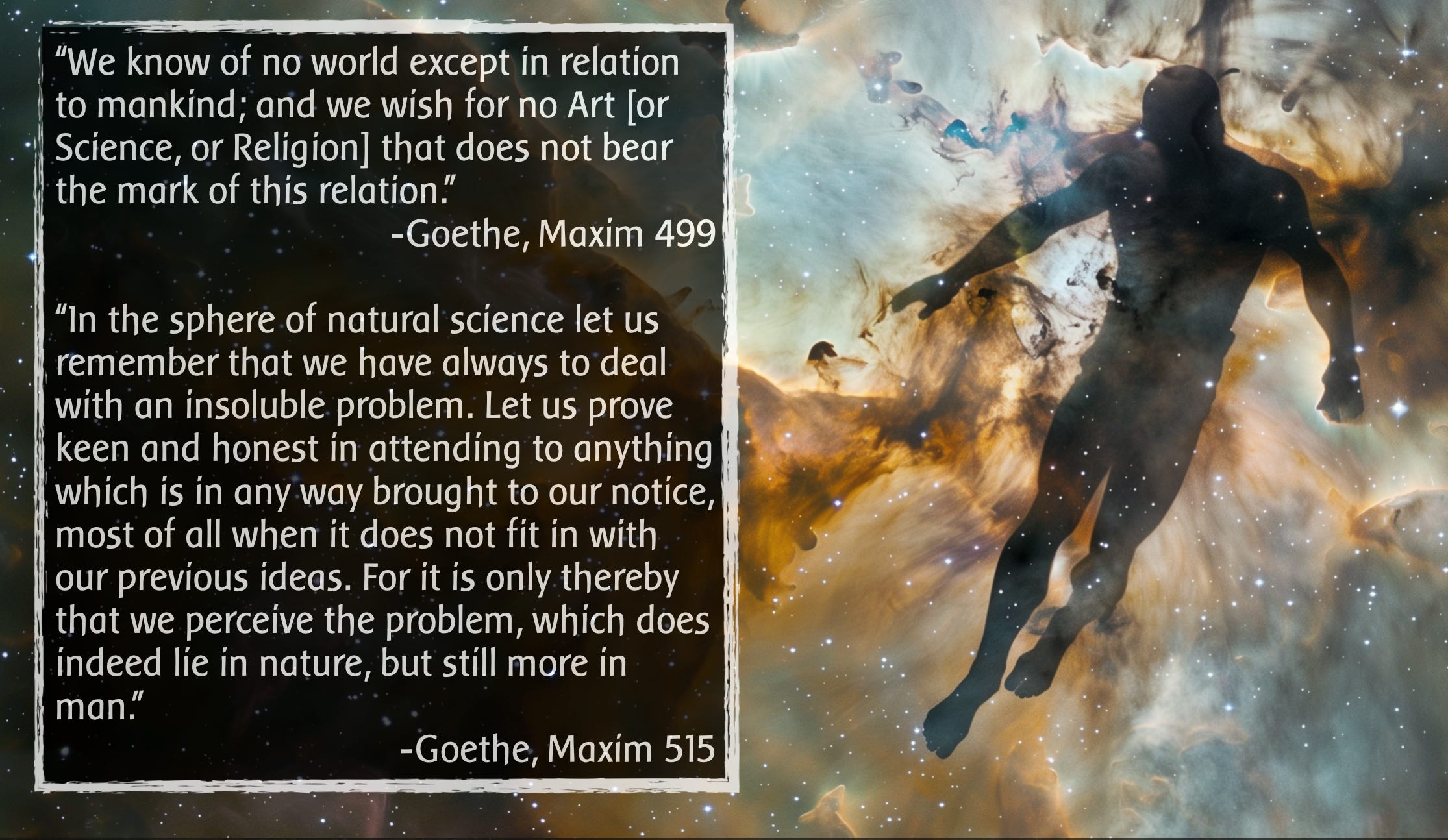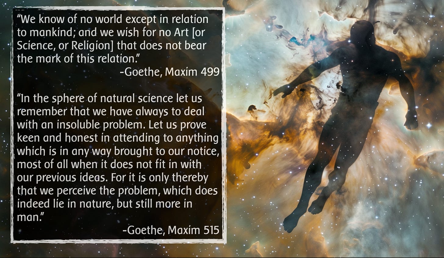 To emphasize the anthropocosmic aspect of this participatory approach to science, let me quote Goethe: “We know of no world except in relation to mankind, to the human being, and we wish for no art, and I add, for no science or religion, that does not bear the mark of this relation.” Goethe also reminds us that “in natural science, we must always deal with an insoluble problem and be keen and honest in attending to anything that challenges our previous ideas. Only by doing so can we perceive the true problem, which lies not just in nature but even more so in ourselves.”