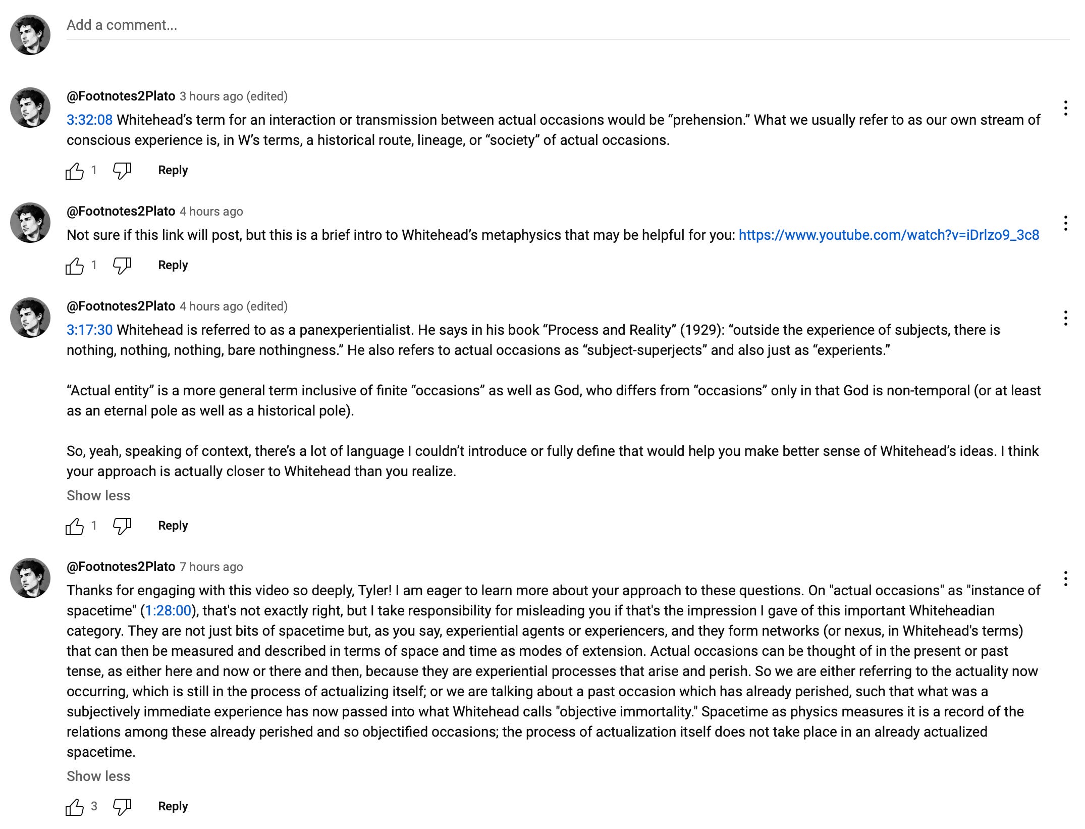Tyler Goldstein’s very long but also very insightful YouTube commentary (see above) responding to my recent dialogue with Curt Jaimungal (“What is the Human Being?”). Tyler had never heard of me or Whitehead before, nor had I heard of Tyler’s “theory of every0ne.” From the sound of it there are a ton of convergent ideas (maybe even more than Tyler realizes!) but also probably some very interesting and hopefully edifying differences. I’m grateful to him for taking the time to respond with such care and insight.