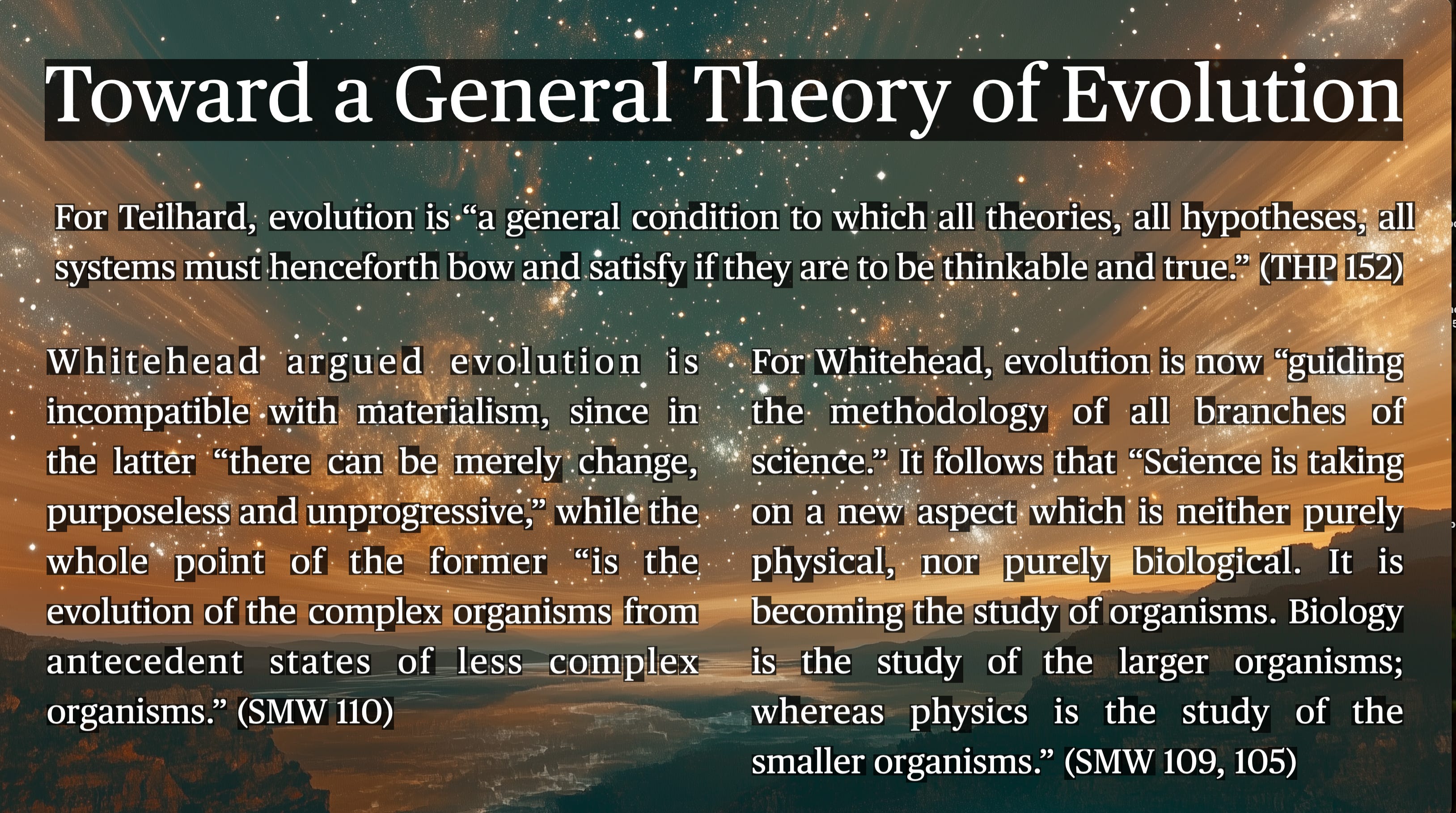 In contrast, Teilhard and Whitehead both propose to generalize the evolutionary paradigm beyond just the biosphere to include the entire universe. Teilhard states that “evolution is a general condition to which all theories, all hypotheses, all systems must henceforth bow and satisfy if they are to be thinkable and true.” Whitehead similarly asserts that science now studies processes that are biological, physical, and social, and that we are dealing with organisms at every scale, from subatomic particles to galaxies. He argues that evolution is incompatible with strict materialism precisely because it demonstrates the real emergence of novel forms of organization—not just rearrangements of inert particles but a growing complexity that realizes deeper forms of value-experience.