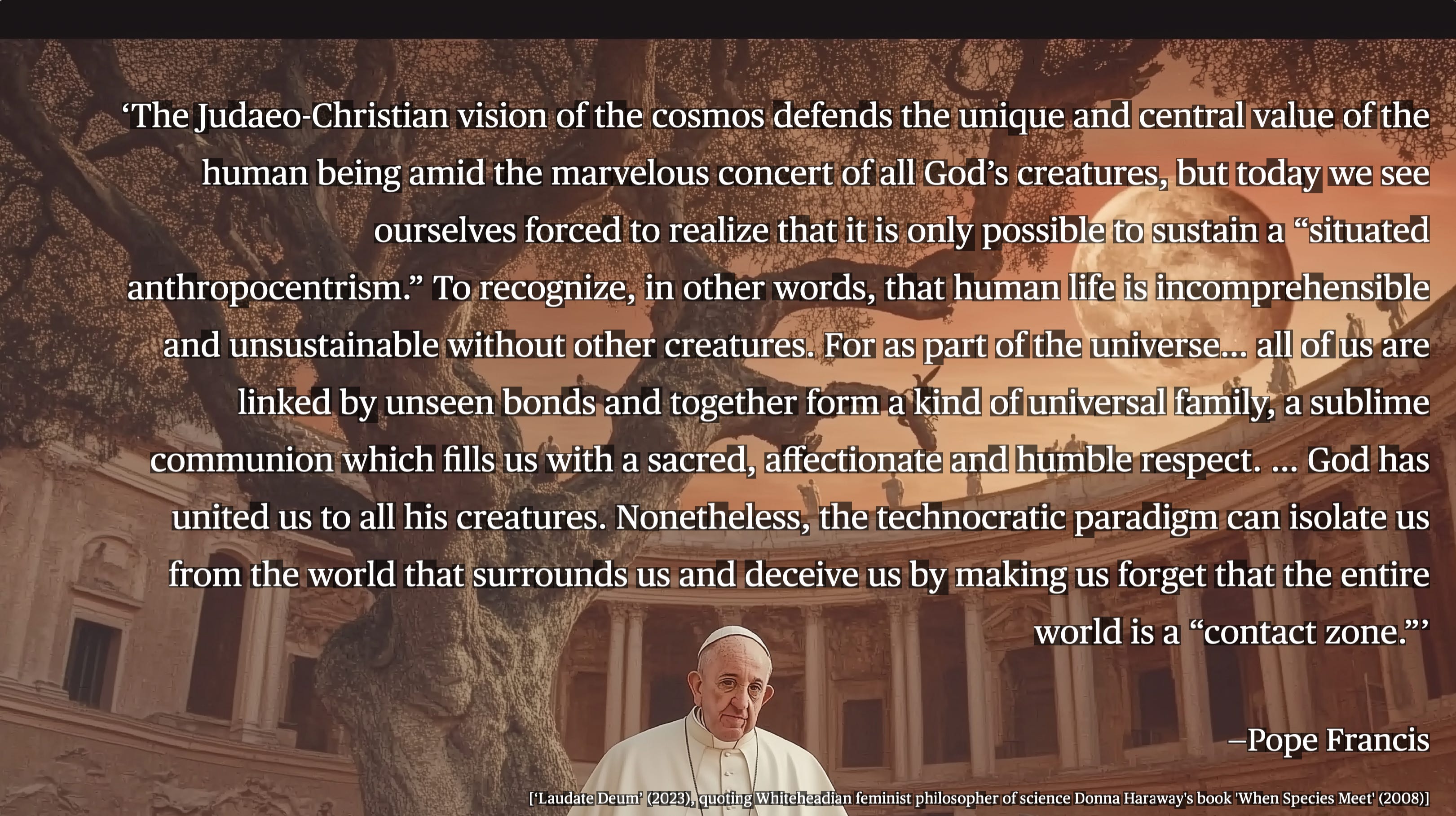 Pope Francis, in a 2023 letter (Laudate Deum), addresses this tension between an exaggerated anthropocentrism and a disregard for our interdependence with the larger earth community. He advocates a situated anthropocentrism: one that recognizes the uniqueness of human capacities and the moral responsibility that follows, but also the complete embeddedness of humanity in the broader network of life. He reminds us that all creatures form a “universal family” linked by unseen bonds. Drawing on Donna Haraway’s phrase “contact zone,” he underscores that the world is not an inert space but a living matrix through which beings encounter one another.