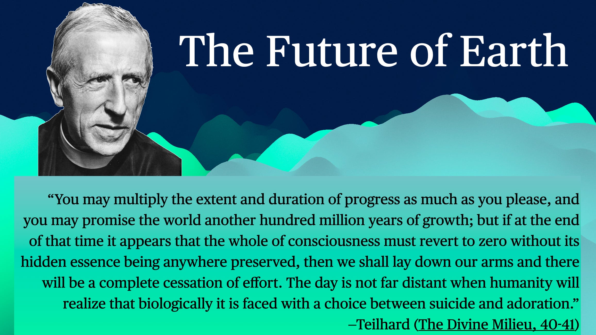 Teilhard, for his part, offers hope not through any denial of science but through a moral and spiritual imperative: “plunging boldly into the vast current of things,” discovering how the absolute that draws us is also mysteriously hidden within us already. This cosmic consciousness is not simply a matter of intellectual insight but requires deep participation, body and soul.