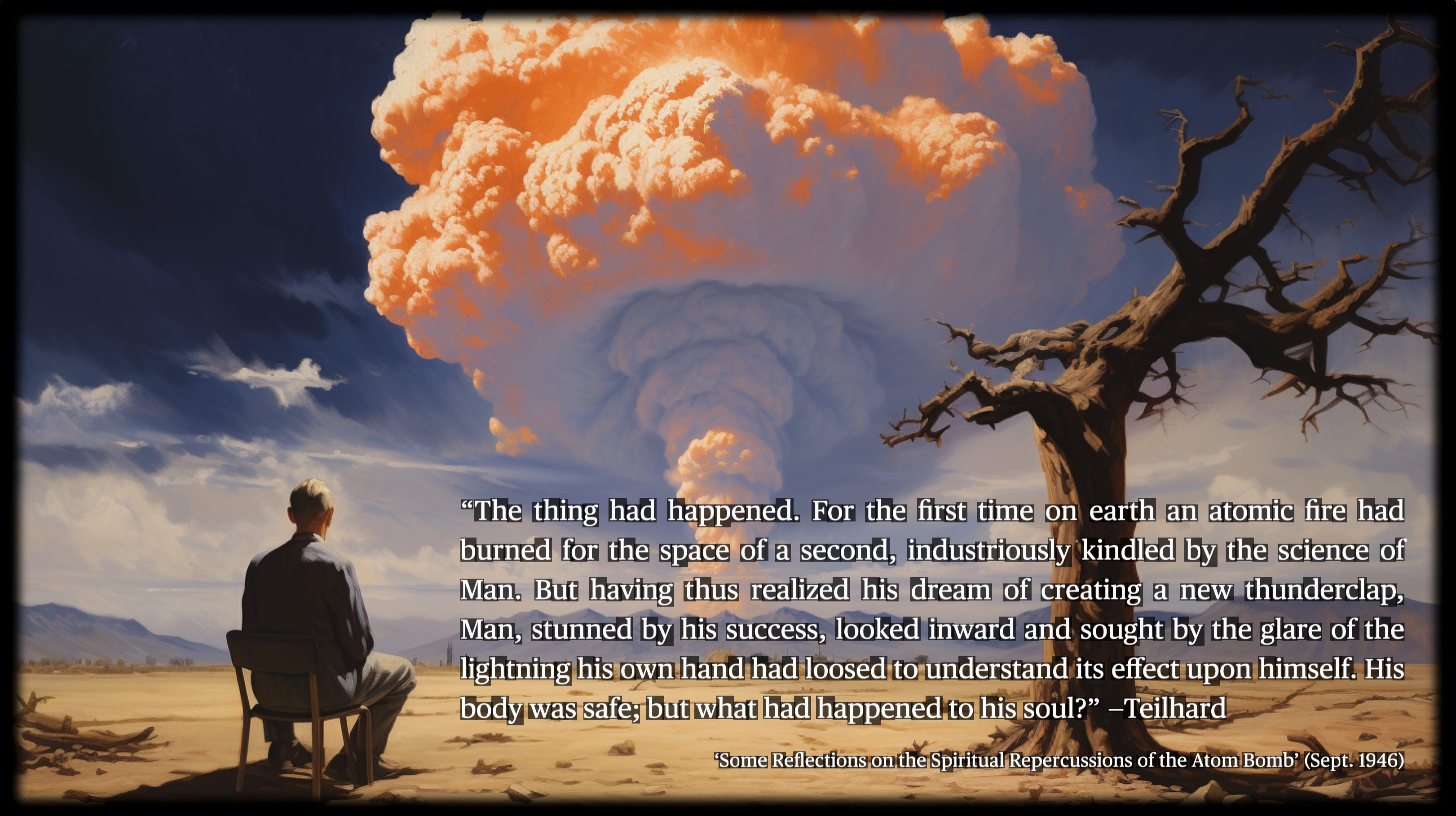 Teilhard’s reflections following the detonation of the atomic bomb in the 1940s reveal his characteristic optimism. While acknowledging the destructive potential of nuclear weapons, he also interprets this unprecedented event—humans artificially unleashing atomic fire—as evidence of our growing spiritual power and capacity for transformation. Teilhard had a similar perspective on World War I, where he served as a stretcher-bearer and perceived the war not simply as violent chaos but as a harbinger of accelerated planetary convergence.