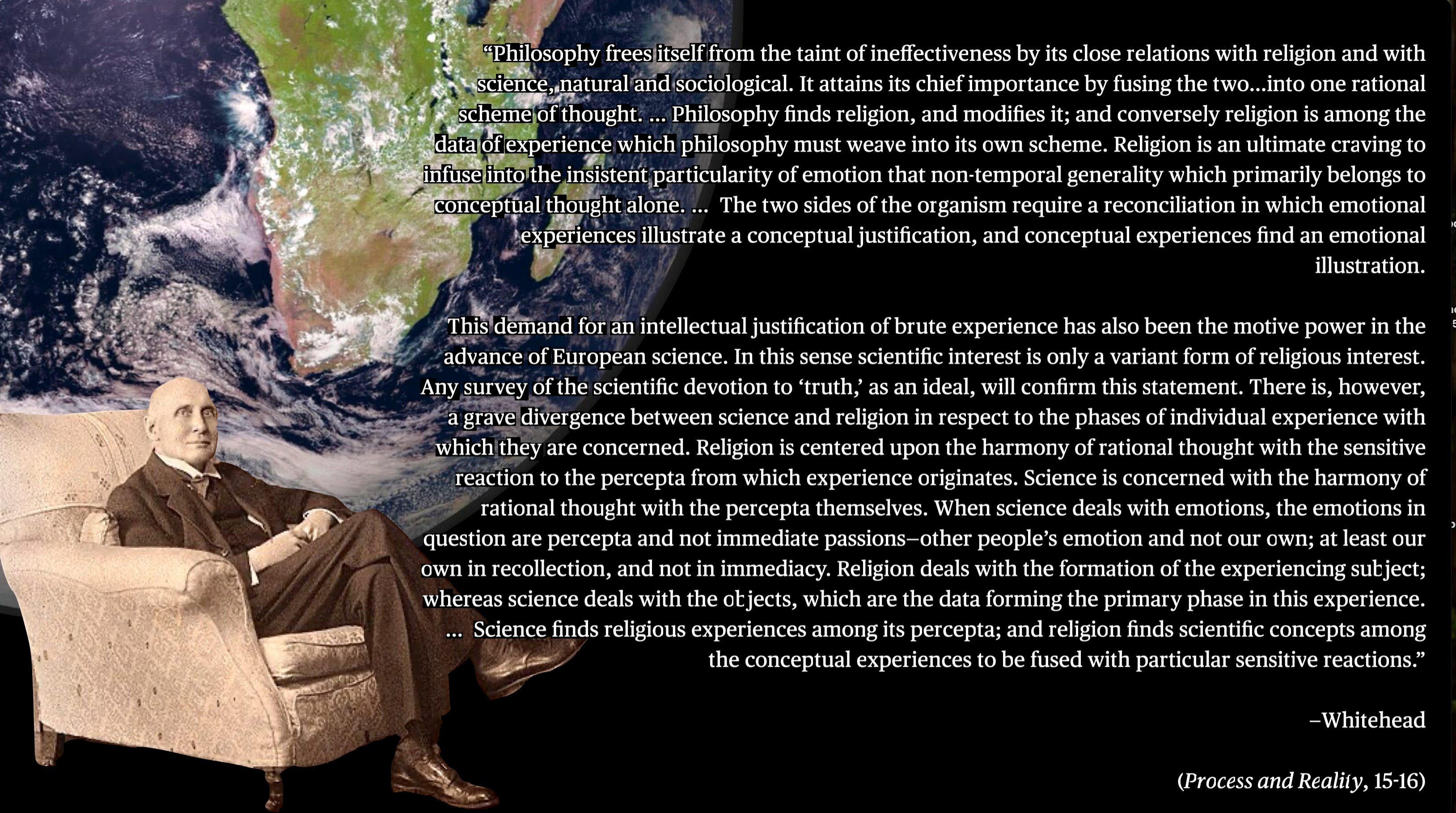 Near the beginning of Process and Reality, Whitehead offers a powerful statement about how science, religion, and philosophy ought to coexist. He writes that philosophy frees itself from ineffectiveness by its close relations with both religion and science, weaving them into one rational scheme of thought. Religion and science, in turn, modify one another. Religion concerns our emotional response to the totality of existence in light of ideals like truth, beauty, goodness, and justice—Whitehead calls these “non-temporal generalities.” Science concerns itself chiefly with the data of sense perception, the objective dimension. Religion deals with the formation of the experiencing subject, whereas science deals with the objects informing the subject’s experience.