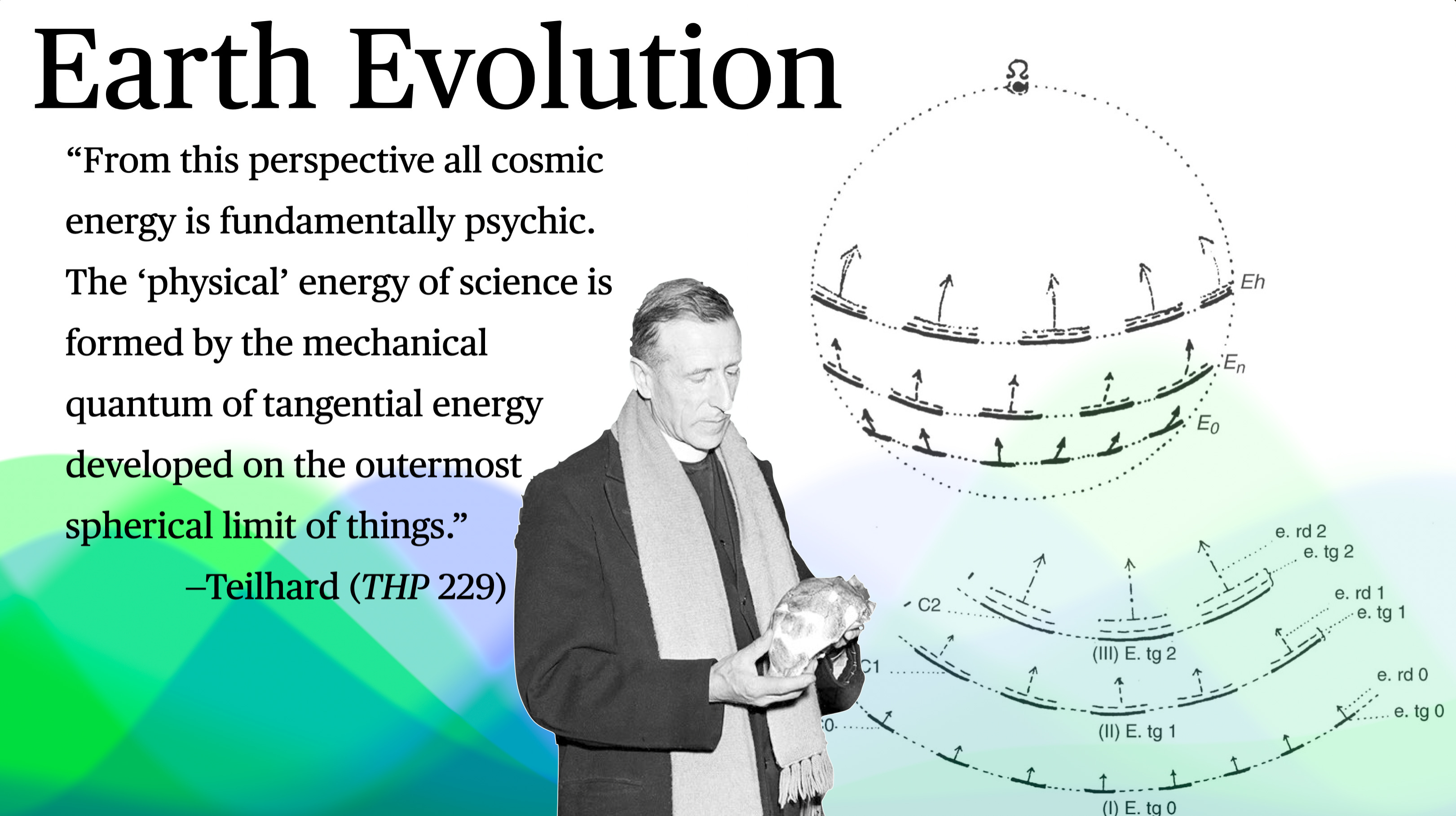 In line with the pansychist or panexperiential stances taken by Teilhard and Whitehead, Schelling suggests that the entire cosmos bears seeds of consciousness from its very beginnings. Teilhard’s principle of “complexity-consciousness” unfolds similarly: as the without (material complexity, or what Teilhard calls “tangential energy”) increases, the within (psychic or interior complexity, or “radial energy”) intensifies in parallel. For Teilhard, this arc of cosmogenesis bends inevitably toward the self-reflective human mind, and ultimately beyond humanity to what he calls the Omega Point. In describing radial and tangential energies as convergent dimensions of cosmic evolution, Teilhard emphasized Earth’s spherical shape to illustrate how the curved trajectory of evolutionary pressure builds and converges upon a new threshold.