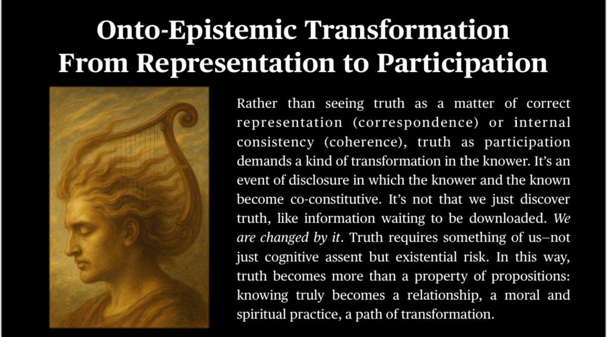 William James advised us to focus on the fruits of experience, not the roots. We can debate metaphysics forever, but the practical measure is whether an experience deepens relationship, reduces narcissistic projection, and enhances the flourishing of life. If we want a fully participatory theory of truth, we still have to ask the perennial metaphysical questions—“Who am I?” and “What is this?”—yet in service of healing it can be wiser to judge by the fruits. Pragmatism keeps us oriented to value: does the vision regenerate life and strengthen our relational web? If so, that is strong evidence in its favor.