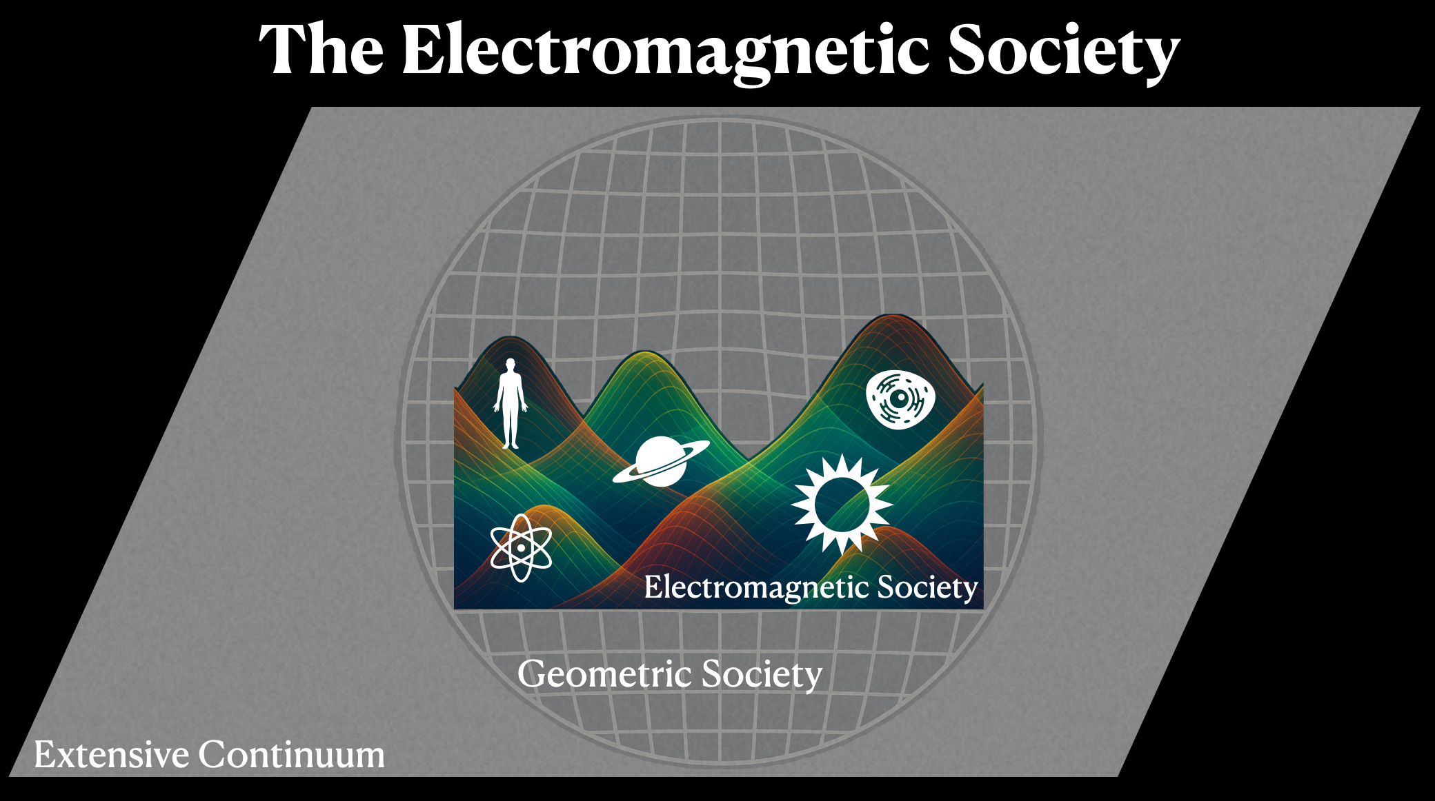 On top of that geometric society, there is the “electromagnetic society.” While the geometric society permits multiple competing systems of measurement and congruence, with no fundamental preference, our cosmic epoch, he described, is the electromagnetic society—which resolves some ambiguities by determining a specific geometric framework, thanks to the additional physical relationships that electromagnetism provides.