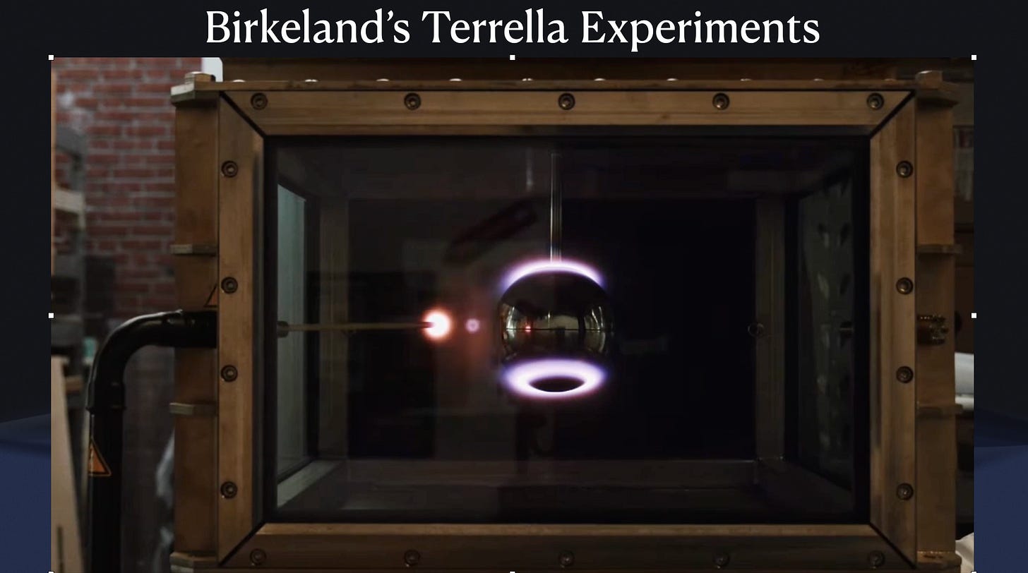 Here’s one of Birkeland’s famous experiments, the so-called Terrella, or “little Earth,” experiments, first conducted in 1913. There is video of him shooting electrons at a magnetized sphere—the “little Earth”—creating an aurora effect. He did this work at the University of Oslo and made expeditions to the Arctic to observe the aurora. He was trying to demonstrate that electromagnetic forces can create the patterns he was seeing in the sky at the North Pole. He was ridiculed for this; the idea that electric currents could flow between the sun and Earth along magnetic field lines was simply not something physicists were ready to accept. Lord Kelvin dismissed his ideas as nonsense. Sidney Chapman, a leading geophysicist, developed an alternative model that rejected the possibility of currents traveling through space.