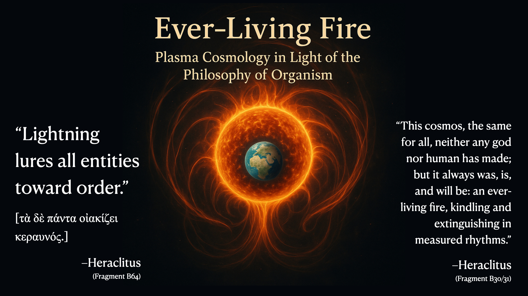 The discovery of plasma dynamics and the self-organizing tendencies of plasmas lends itself, I think, more to an organic metaphor than a mechanistic one. I’ve started here on my title slide with a few quotes from who we might call the first process philosopher, the ancient Greek presocratic physiologos, or natural philosopher, Heraclitus. He said that all things are fire—an “ever-living fire.” I’ve translated another of his fragments as “lightning lures all entities toward order.” It’s usually rendered, “the thunderbolt steers all things,” but I’ve translated it in a more Whiteheadian way.