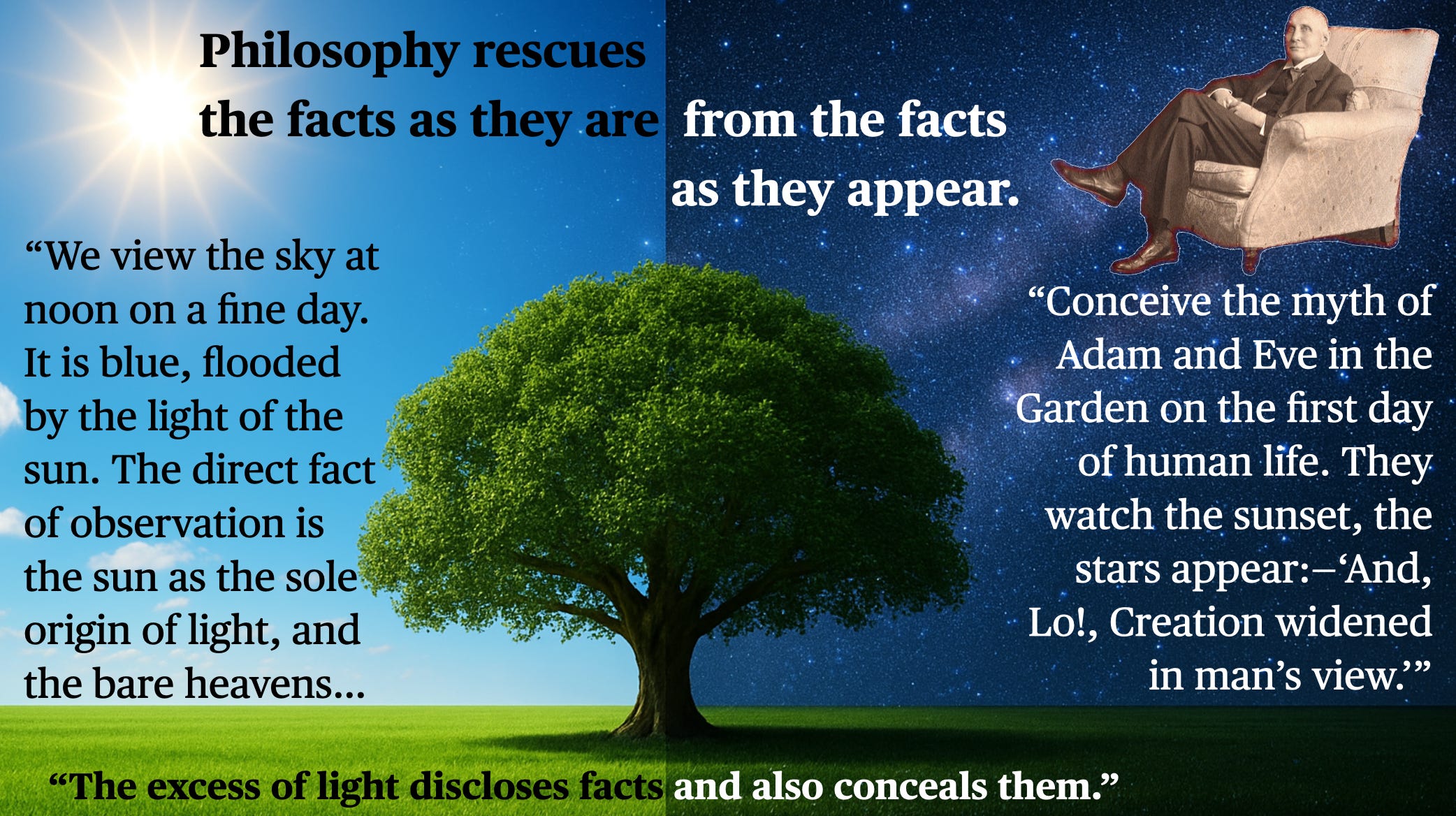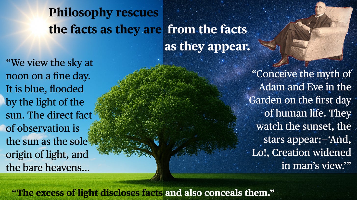 “Philosophy’s task is to rescue the facts as they are from the facts as they appear. We view the sky at noon on a fine day. It is blue, flooded by the light of the sun. The direct fact of observation is the sun as the sole origin of light and the bare heavens. Conceive the myth of Adam and Eve in the garden on the first day of human life. They watch the sunset, the stars appear, ‘And lo, creation widened in man’s view.’” (He is quoting Joseph Blanco White.)